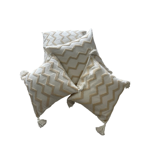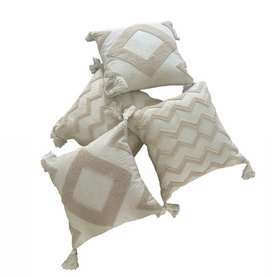 Large Square Cushions - Cream Beige Tufted Zig Zag Pattern With Tassels x 2 Bundle